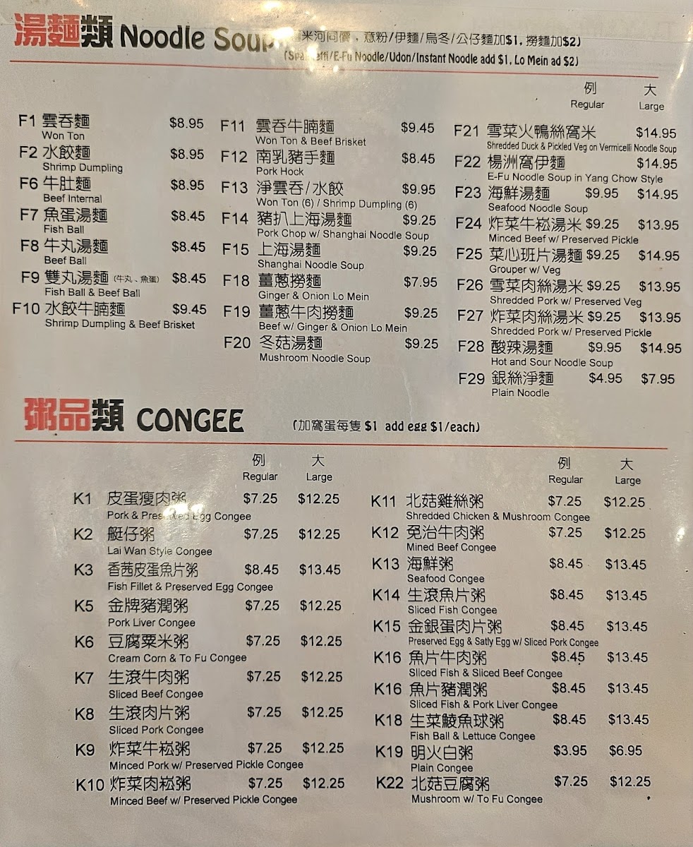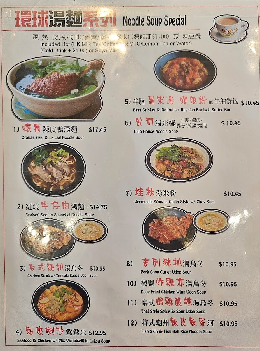 The menu at Joy Noodle Cafe 樂心餐廳 offers a selection of Hong Kong-style fast food and cha chaan teng classics, featuring a variety of noodle soups, congee dishes, and rice plates. The menu is organized into several key categories that cater to different tastes and meal occasions.