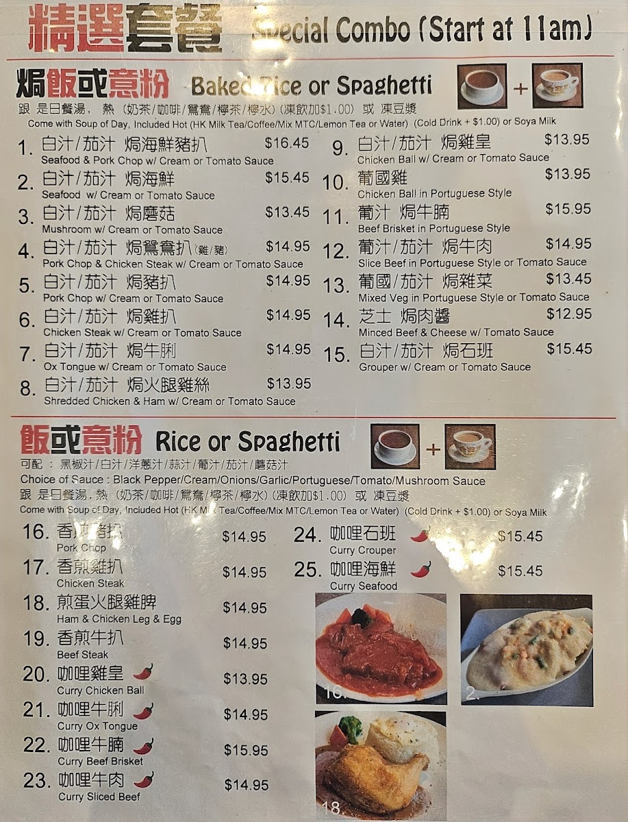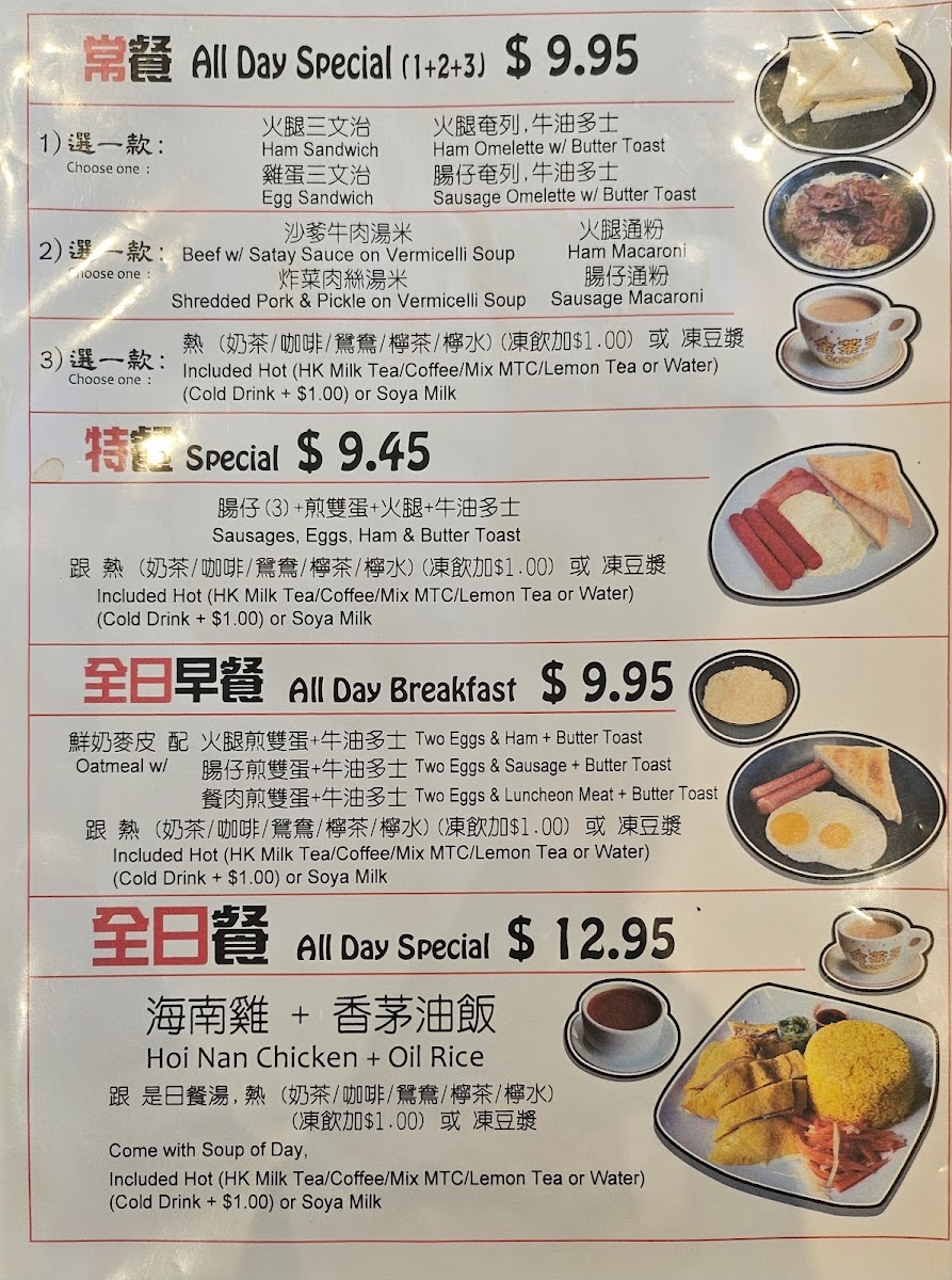 In addition to food, a variety of drink options such as HK milk tea, iced lemon tea, and soup coffee complement the meals, reflecting the typical offerings of a Hong Kong-style cafe.